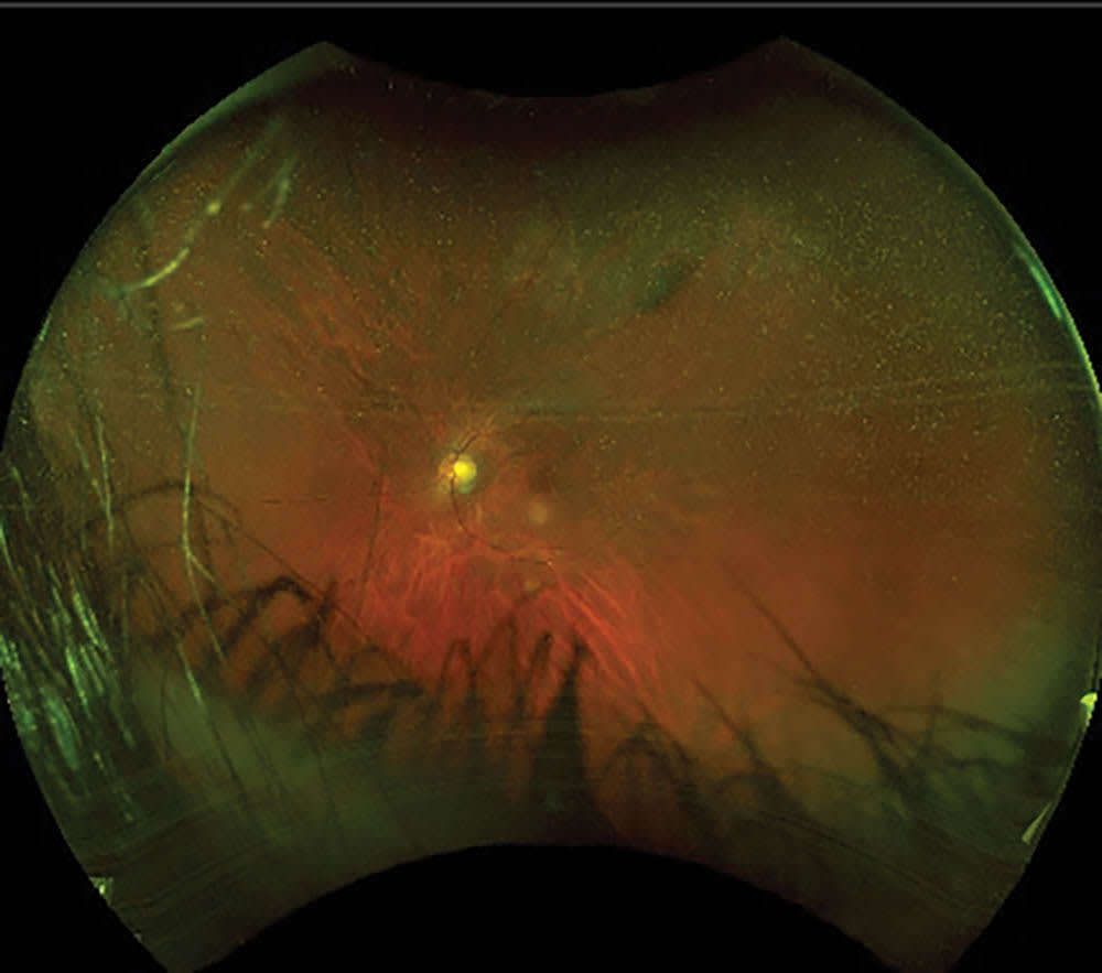 On examination, patient’s BCVA was 20/20 OD and 20/40 OS. IOP was WNL and anterior chamber examination was normal. The vitreous cavity of the left eye exhibited “tobacco dusting” intermixed with a mild vitreous hemorrhage and a mid-peripheral superior retinal tear (Figure 1). Laserpexy was discussed with the patient, and she underwent the procedure uneventfully. Upon return 1 week later, the vitreous hemorrhage had subsided and BCVA returned to 20/20 OS (Figure 2). Patient was advised to wear protective eyewear when engaging in pickleball matches in the future.