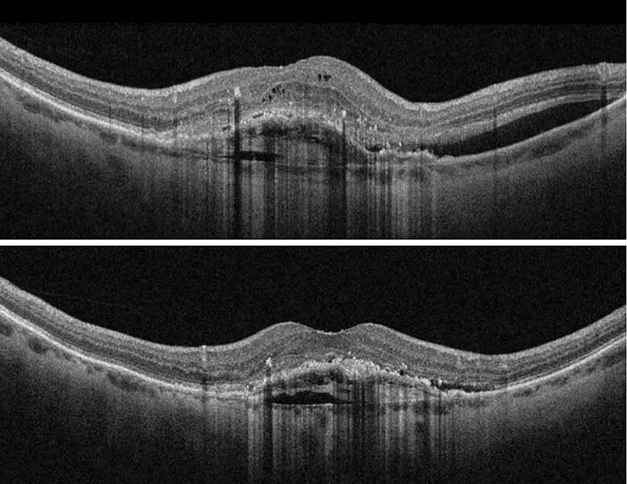 Figure 1. These optical coherence tomography (OCT) images of an 87-year-old female illustrate the impact of faricimab on pigment epithelial detachment (PED). The treatment-naïve patient presented with a large serous PED (A), which showed significant improvement after the first dose of faricimab (B). Images courtesy Nirojini Sivachandran, MD.